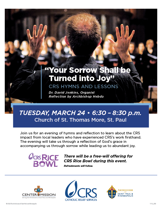 Join us for an evening of hymns and reflection to learn about the Catholic Relief Services (CRS) impact from local leaders who have experienced CRSโs work firsthand. The evening will take us through a reflection of Godโs grace in accompanying us through sorrow while leading us to abundant joy.