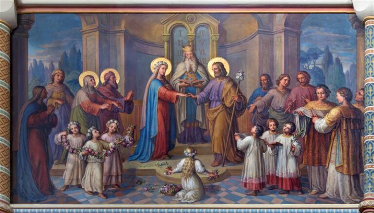 - First form: When two Catholics marry, the Sacrament of Matrimony normally takes place within Mass. This is fitting because of the connections all sacraments have with the Paschal mystery of Christ (Catechism of the Catholic Church, no. 1621) and because it is in the Eucharist that Catholic married couples “meet the one who is the source of their marriage” (USCCB, Marriage: Love and Life in the Divine Plan, p. 52). Receiving the Eucharist as their “first meal” together is a beautiful expression of the newlyweds’ reliance on God to sustain and strengthen them throughout their lives.